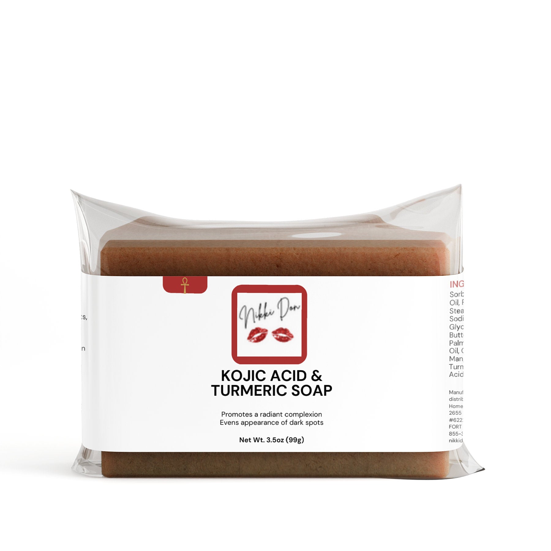 Ingredients: Sorbitol, Organic Coconut Oil, Propylene Glycol, Stearic Acid, Water, Sodium Hydroxide, Kosher Glycerin, Organic Shea Butter, Organic Sustainable Palm Oil, Organic Lemon Oil, Organic Cocoa Butter, Mango Butter, Organic Turmeric Powder, Kojic Acid.